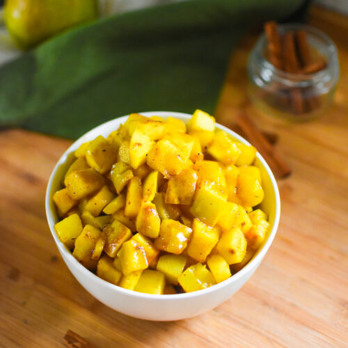These stewed pears are perfectly spiced with a touch of honey for cozy flavor that has become a staple in my breakfast time on cold winter mornings! Let me show you how to make them in about 20 minutes with simple ingredients.